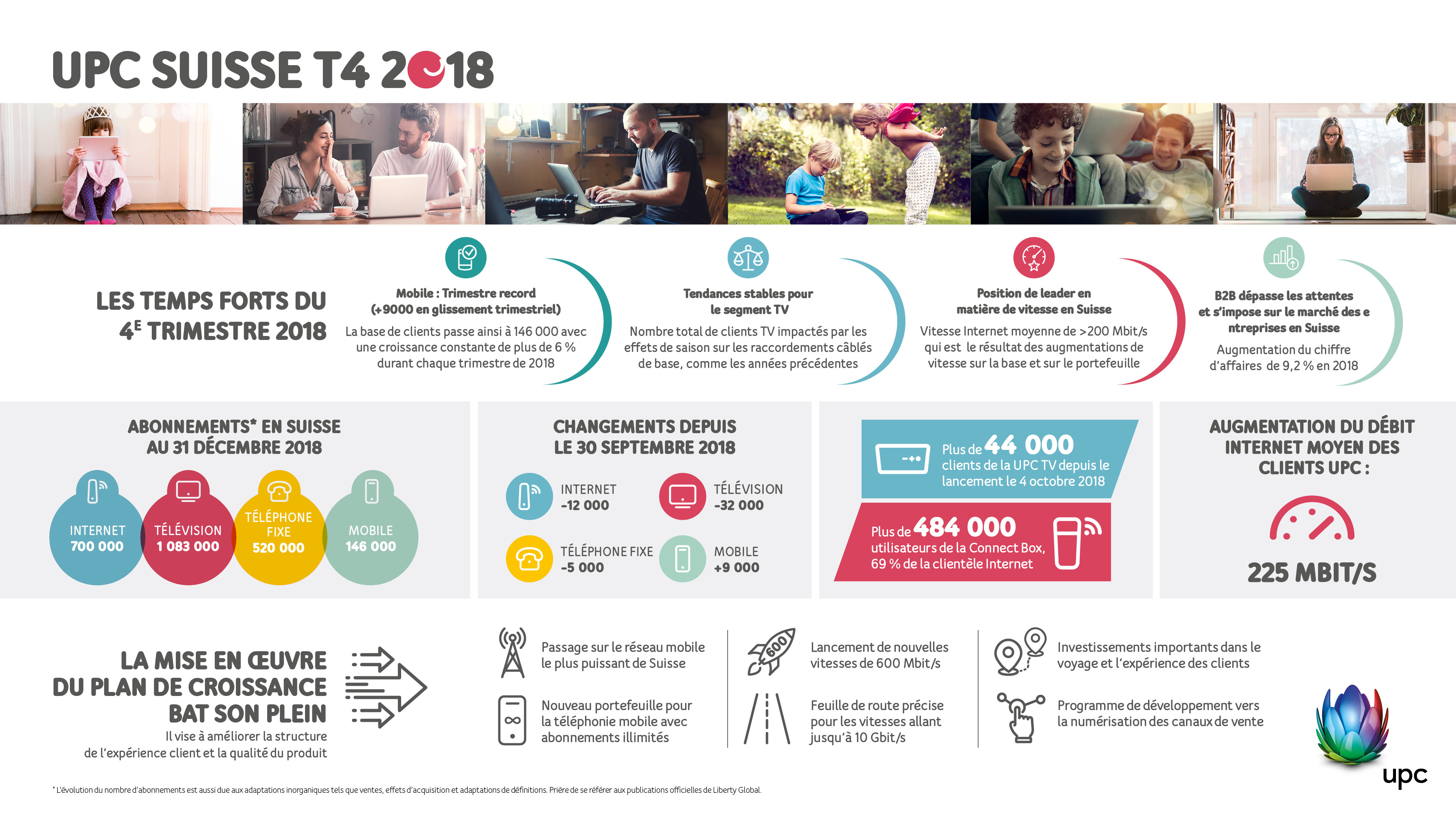 Trimestre record pour le segment de la téléphonie mobile de UPC en 2018, tendances clients stables pour la TV et Internet.