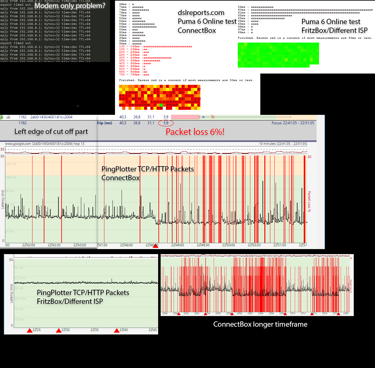 Ich denke das passt eher zu überlasteter CPU in der ConnectBox, wie ja auch in den Artikeln zum Puma 6 Chipset geschildert. Ich kann mir durchaus vorstellen, dass da wirklich alle ConnectBox Modems betroffen sind, nicht nur meines. Da spricht natürlich dagegen dass sich sonst niemand beschwert, aber die Probleme sind halt doch eher subtil und wenn man nicht vorher weiß wo man messen muss auch sehr leicht zu übersehen.