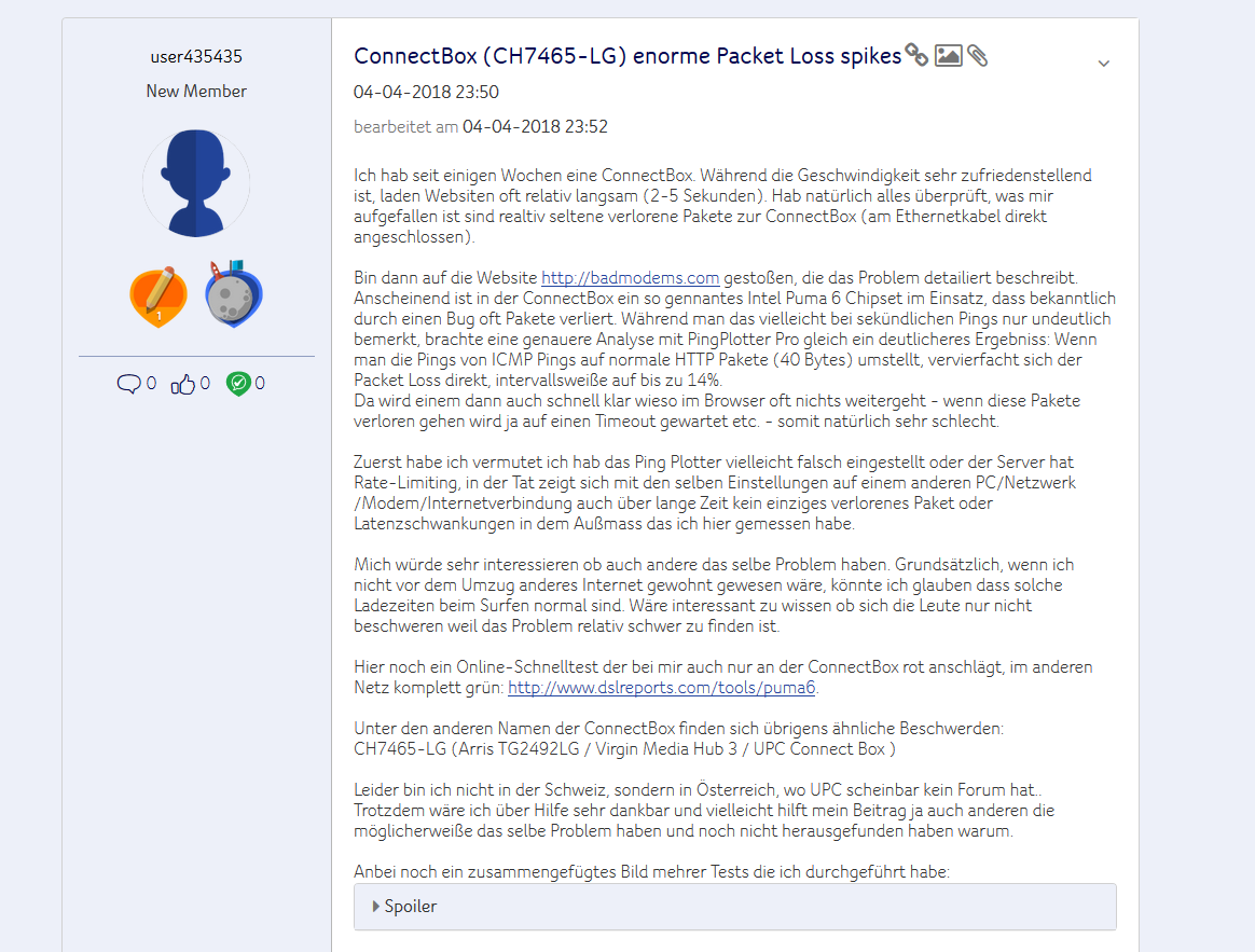Aber genug Spekulation von meiner Seite, Klarheit kann da ziemlich sicher der Online Test dazu schaffen. Der verwendet eben viele kleine Packete, für ein normales Modem kein Problem, aber bei meiner ConnectBox absolut im roten Bereich. Magst du das bitte mal eine Minute testen? Gehe derweil noch davon aus dass es wirklich an diesem Puma 6 Chipset liegt und alle ConnectBoxen davon betroffen sind.
