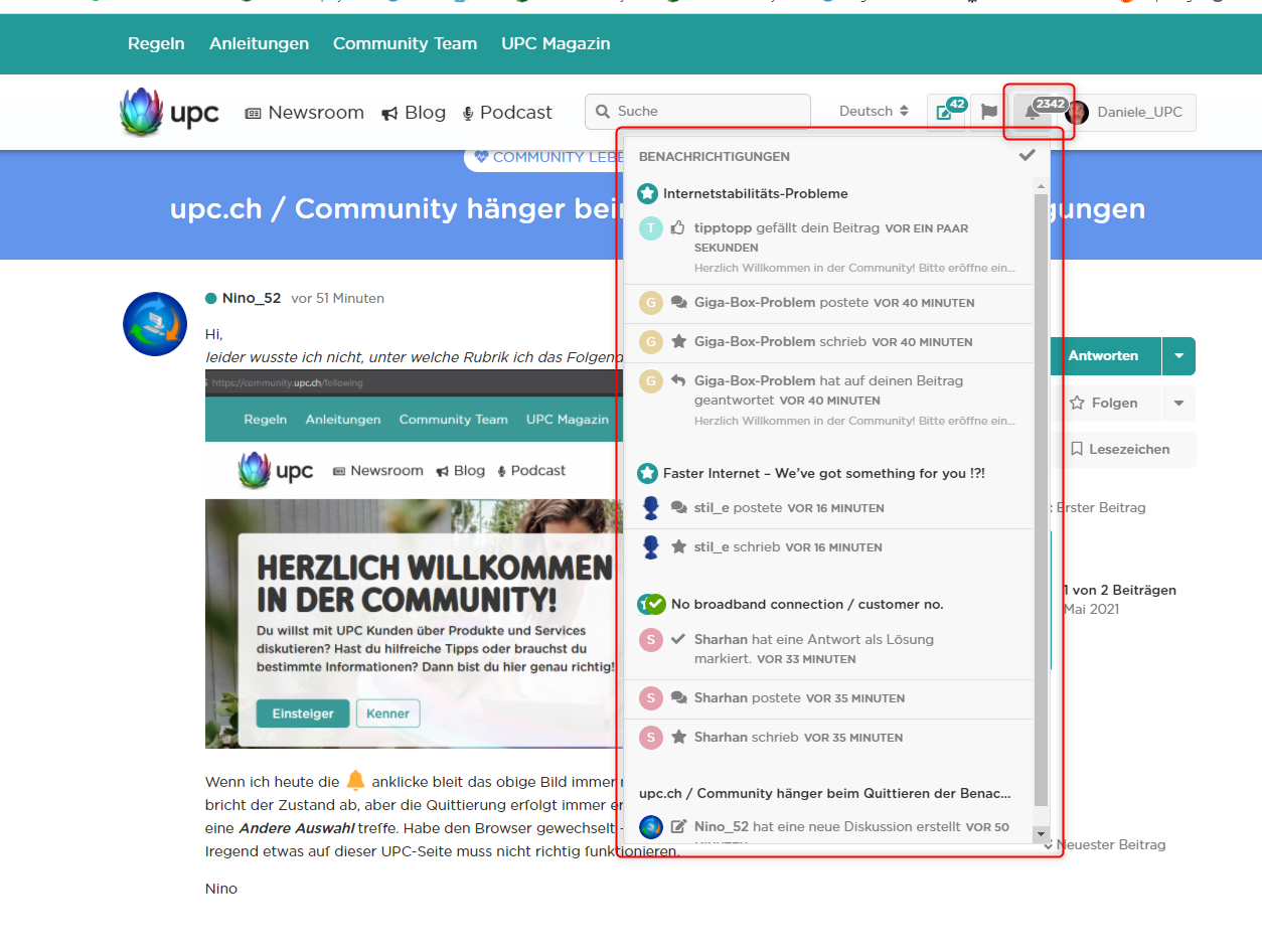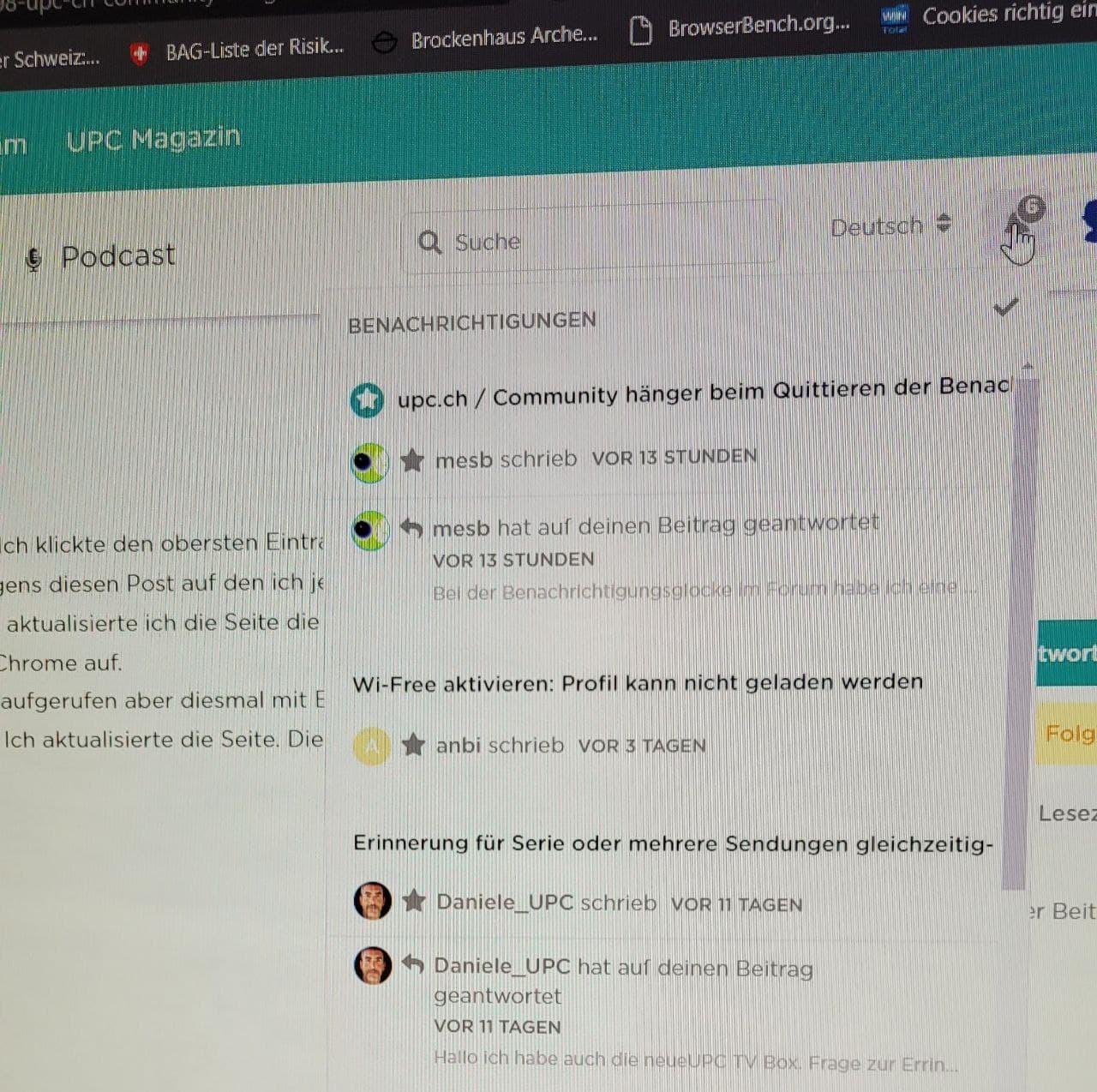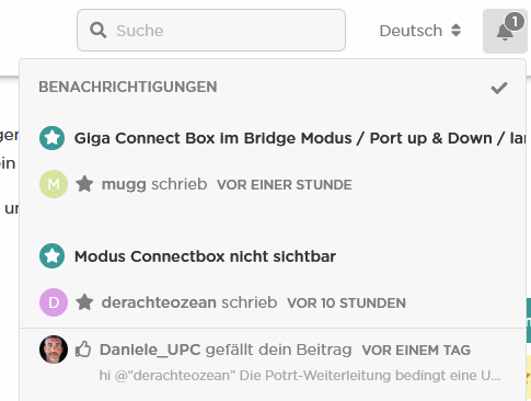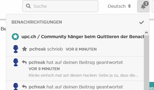 Wenn ich heute die 🔔 anklicke bleit das obige Bild immer mal wieder beständig hängen. Mit Seite neu laden bricht der Zustand ab, aber die Quittierung erfolgt immer erst, wenn ich z.B. Alle Diskusionen verlasse und eine Andere Auswahl treffe. Habe den Browser gewechselt - das gleiche Verhalten!