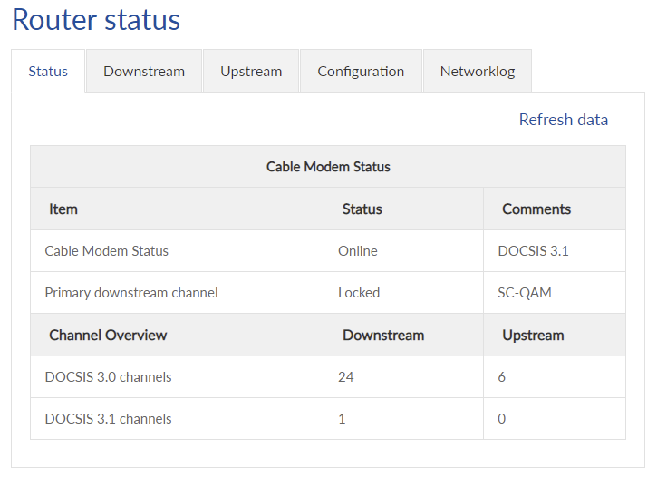 Wenn ich aber im Network Status nachschaue, sehe ich das fast alle Kanäle nur DOCSIS 3.0 sind, einzig ein Kanal ist DOCSIS 3.1: