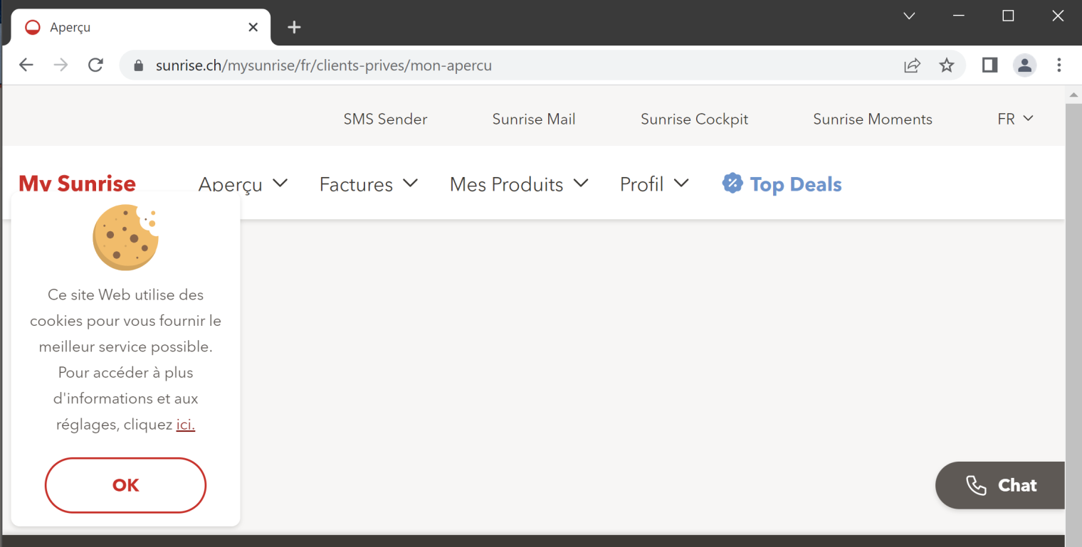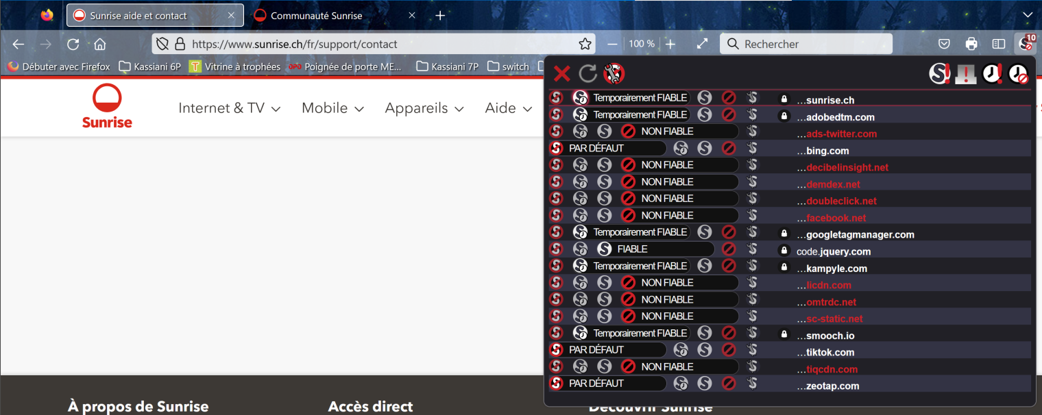 Otoro donc… depuis la page d’accueil: https://www.sunrise.ch/fr/home si l’on clique sur My Sunrise (tout à droite) on arrive sur une page qui reste vide. mais j’ai trouvé par hasard une autre manière d’accéder à mon espace client: depuis la page de la communauté sunrise: https://community.sunrise.ch/ il y a un ‘My Sunrise’ (en haut à droite) qui lui pointe sur: https://www.sunrise.ch/mysunrise/fr/clients-prives/login et ce lien nous mène sur une page de login qui fonctionne et qui fonctionne même en navigation privée avec tous les blocages qu’il faut. 🎉