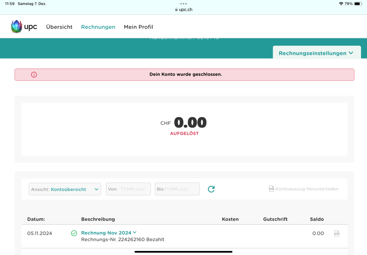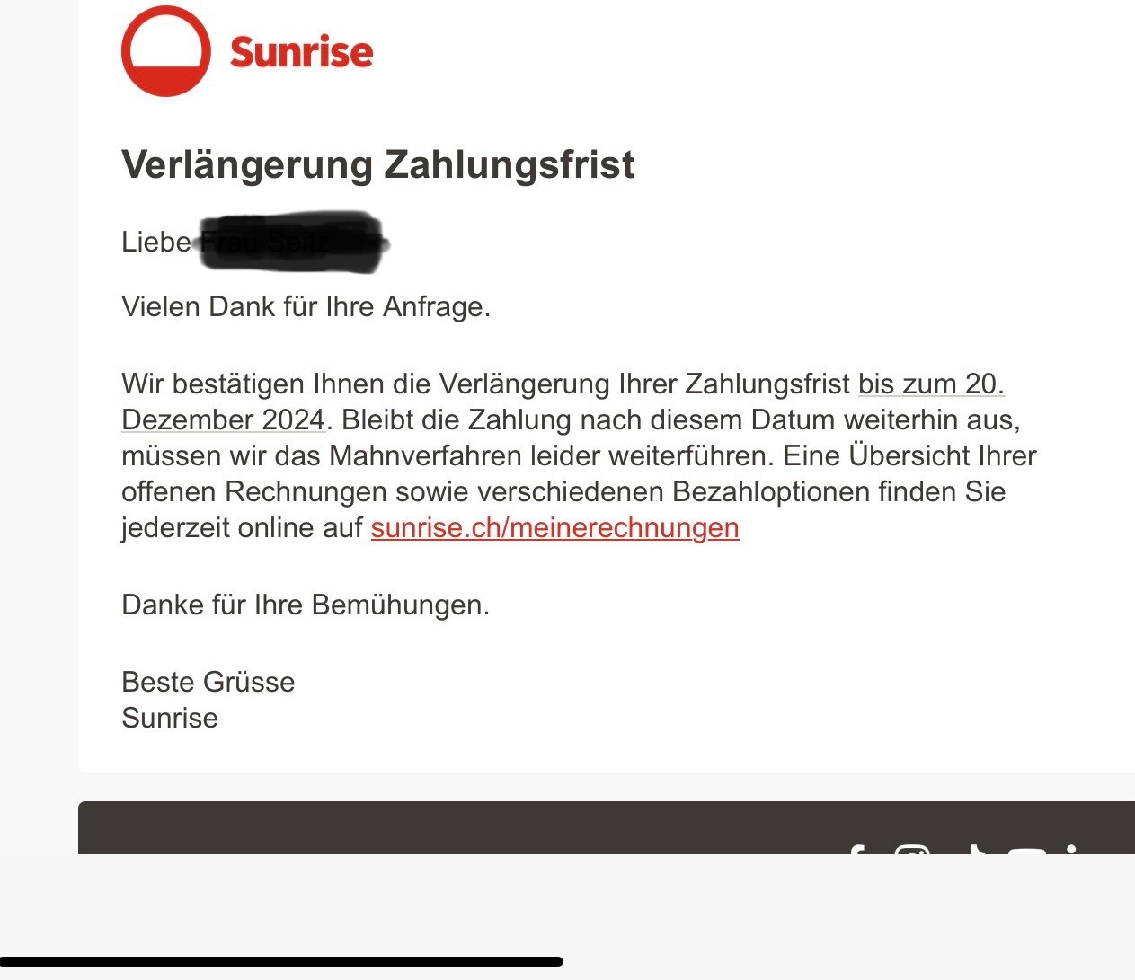 Dann ist der Ball bei Sunrise. Mahnungen etc. erfolgen nur noch, wenn die Bank Must baut (war bei mir mal der Fall, konnte leicht gelöst werden) iser das Konto den Vetrag nicht deckt.
