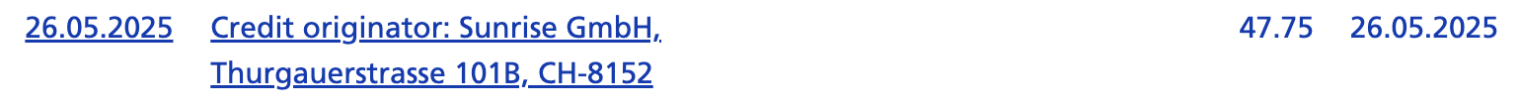 Ich bin mit Kündigungstermin 13. Januar 2025 mit Internet und Festnetz von UPC zu Sunrise gewechselt und habe seither nur noch eine Kauf-Digicard und damit keine laufenden Kosten mehr bei UPC. Für Januar hatte UPC noch den Gesamtmonatsbetrag verrechnet, den ich bezahlte. Es ergab sich damit ein Guthaben von CHF 47.74.