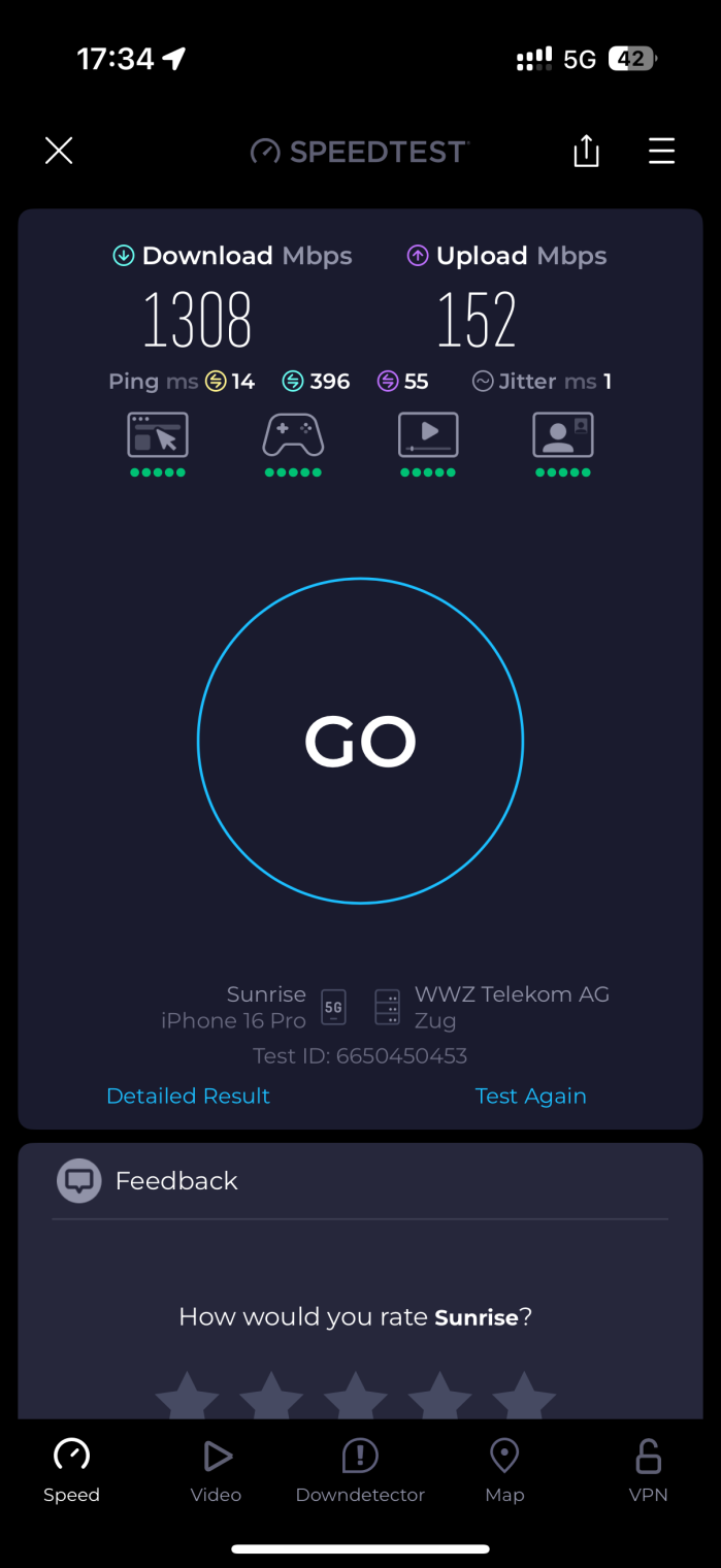 cs-mini Komisch ist nur, dass ich die Geschwindigkeit nie erreiche mit dem iPhone 16 Pro und unmittelbarer Nähe zur Antenne. Bei der Extra SIM - ich spreche von „extra talk & surf“ - ist bei dieser der Speed und Einsatz in einem Mobile Router auch begrenzt?