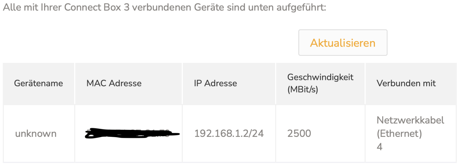Schau in den Einstellung der Connect Box 3 nach, was unter Verbunde Geräte angezeigt wird.