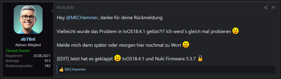 Zur Problemlösung sind profunde Netzwerktechnikkenntnisse erforderlich und es muss der Datenverkehr auf dem Ethernet-Port zur Apple TV-Box aufgezeichnet und mit Wireshark untersucht werden. Mit Wireshark ist zu untersuchen, weshalb der (über IPv4) abgewickelte Multicast-Datenverkehr von mDNS nicht funktioniert, oder ob “in einer anderen Ecke” ein Netzwerkproblem vorliegt, welches den Matter-Datenverkehr blockiert.