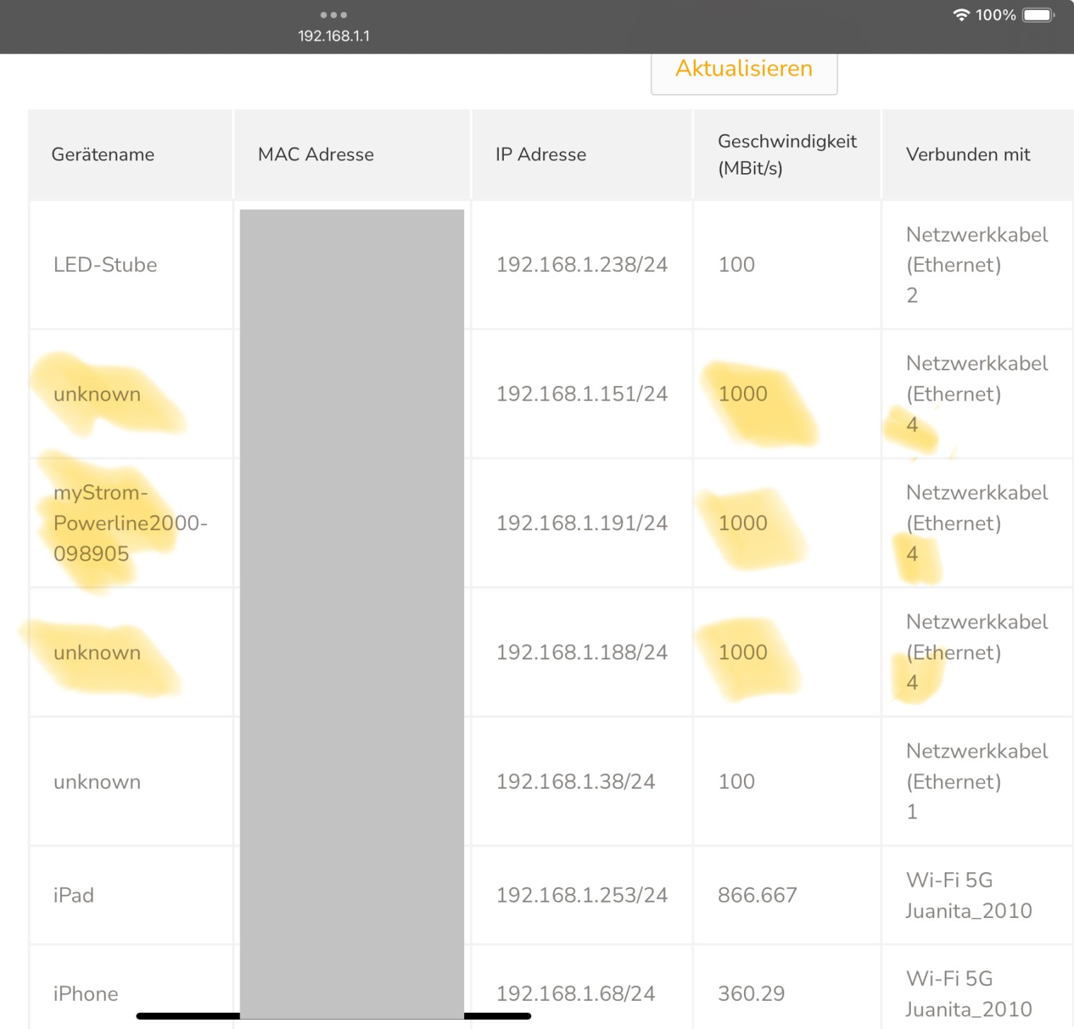 Das Modem steht im Wohnzimmer. Angeschlossen per LAN sind eine Hue Bridge, ein Netzwerkplayer und ein Powerline-Adapter für meine PS5 in meinem Büro. Nun sas spezielle, seit dem Upgrade habe ich auf meiner PS5 nur noch ca. 130/30 Mbit/s und davor, mit userem 500er-Abo ca. 300/50 Mbit/s. Bei diversen Speedtests über W-LAN habe ich immer werte von 700-800 Mbit/s, also über W-LAN ist alles i.O.