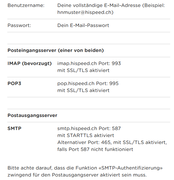 Bei Google Mail auf Android sollte der Account als Sonstige eingerichtet werden. Dann den IMAP-Dienst wählen. Passwort eintragen und den Server auf imap.hispeed.ch ändern und auf Weiter klicken. Bei den Einstellungen für Ausgangsserver den Server auf smtp.hispeed.ch ändern auf Weiter klicken und das Setup beenden.