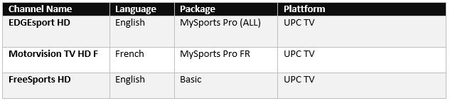Il 26 agosto faremo nuovi aggiornamenti dei canali su UPC TV. Tra le altre cose introdurremo 3 nuovi canali sportivi in HD: