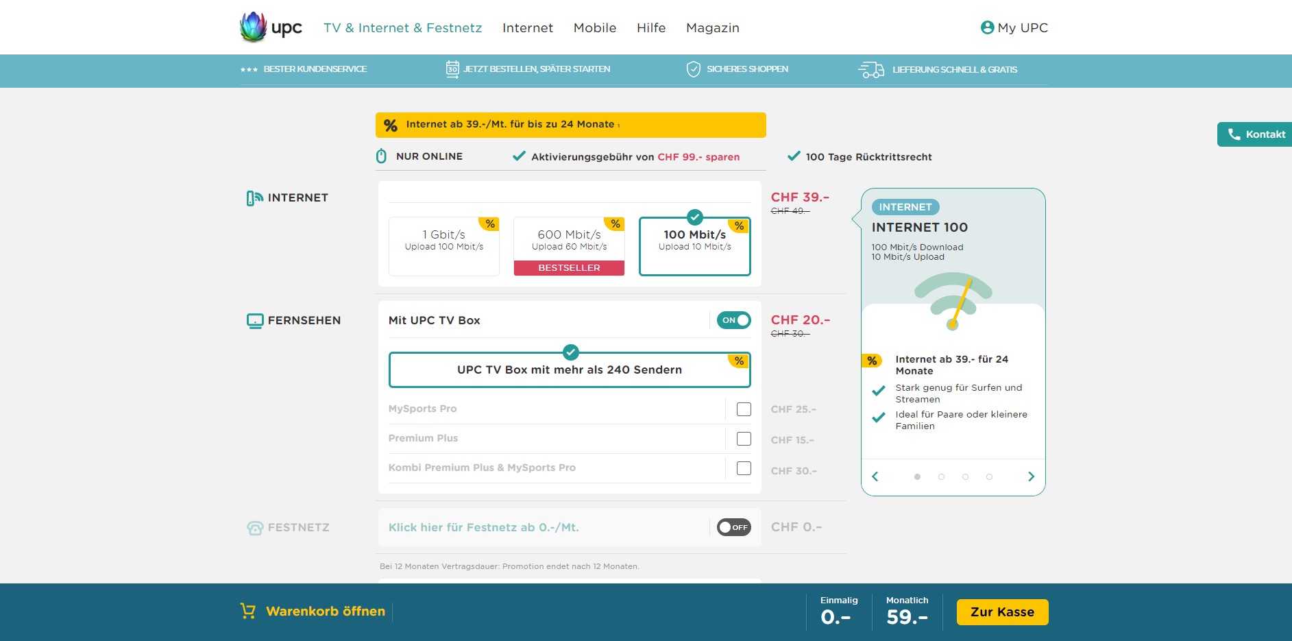 Ich bin Neukunde und habe das 12 Monate Internet 100Mbit für 39.- mit UPC TV für 20.- ohne Aktivierungsgebühr Angebot bestellt: