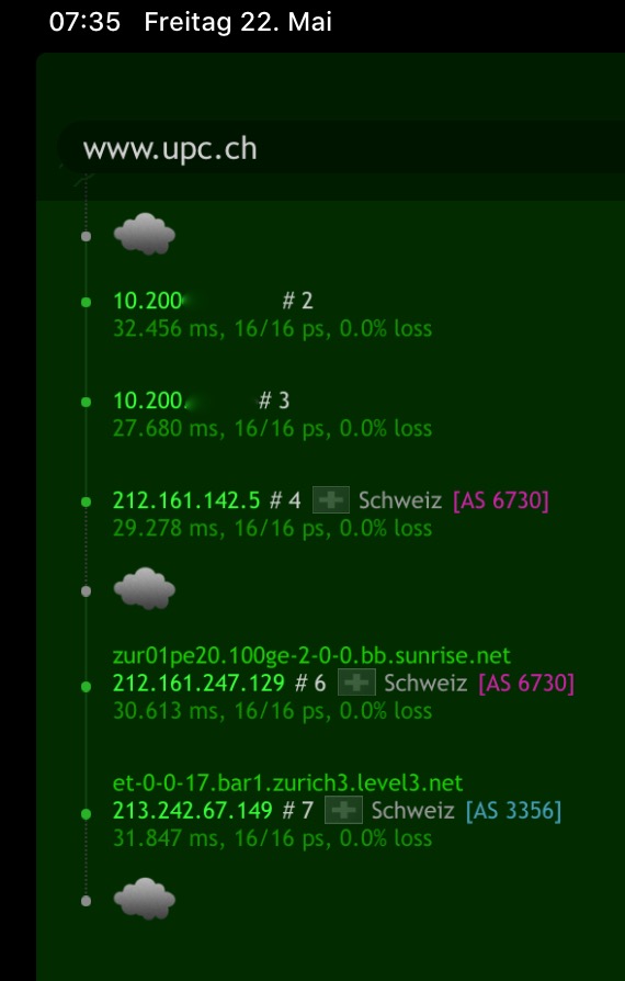 Wenn die Route mal steht geht es einigermassen. Aus Endbenutzersicht dauert es 5-10 Sekunden bis eine Website überhaupt reagiert, und danach lädt sie ok. Beim nächsten Click wieder dasselbe. Auch beim Speedtest sieht man dies: Die ersten 2-3 Messungen sind bei Null, danach steigt es an auf die 600Mbit/s die ich haben sollte.