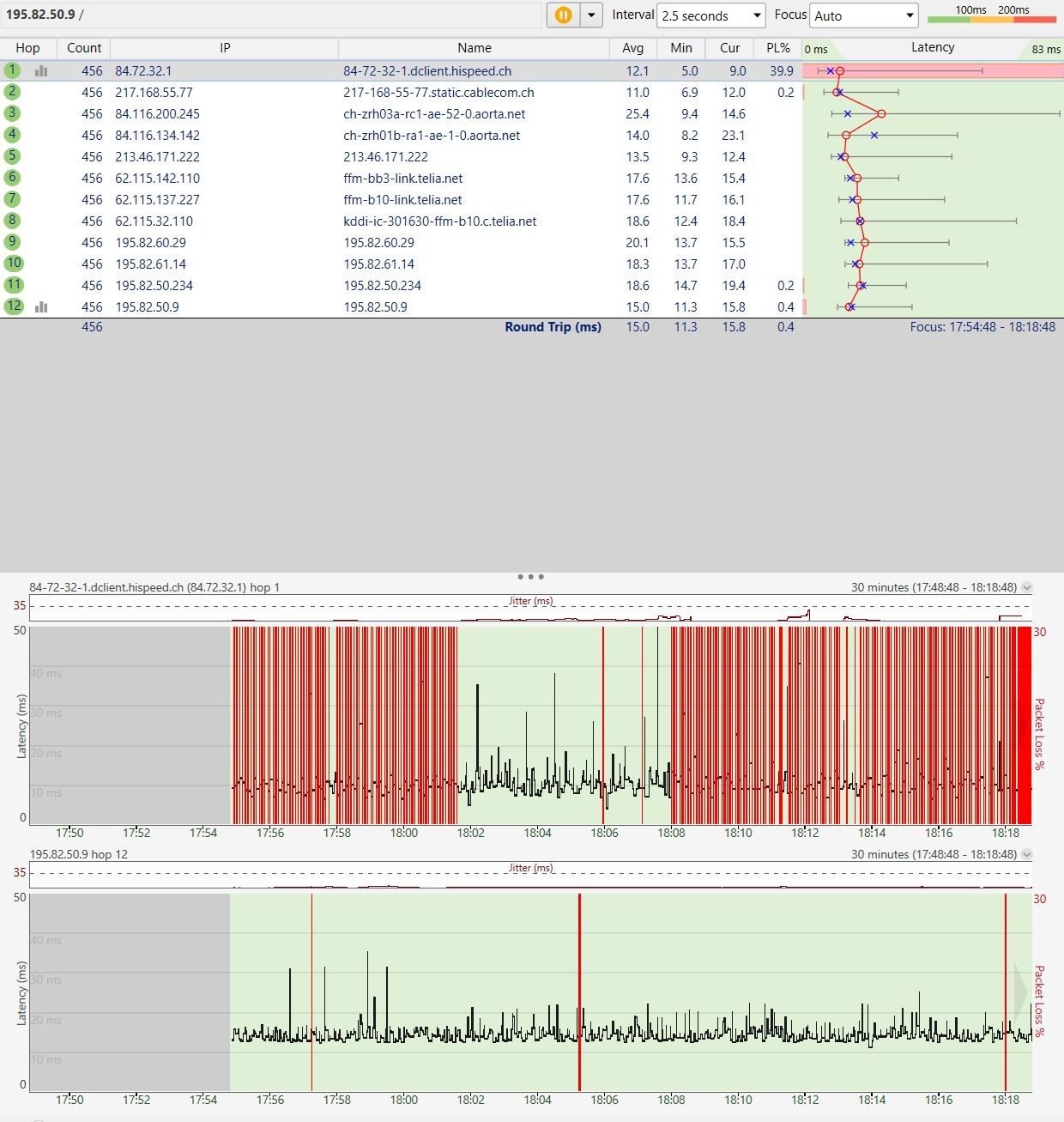 Ich habe mal den Weg mit PingPlotter ausgewertet. Dort sehe ich einen 40% Paketverlust beim ersten Hop und bei der Adresse: 84-72-32-1.dclient.hispeed.ch