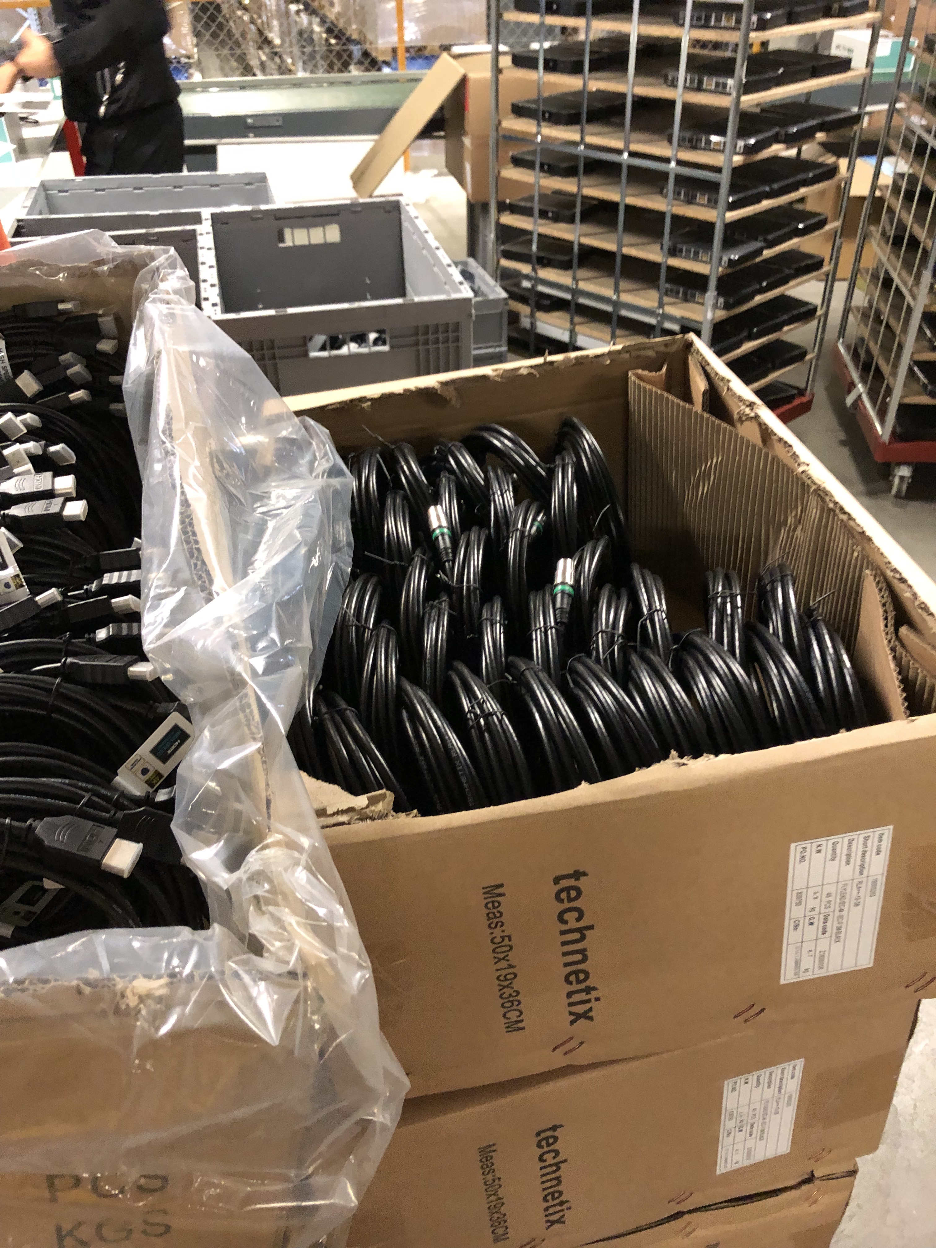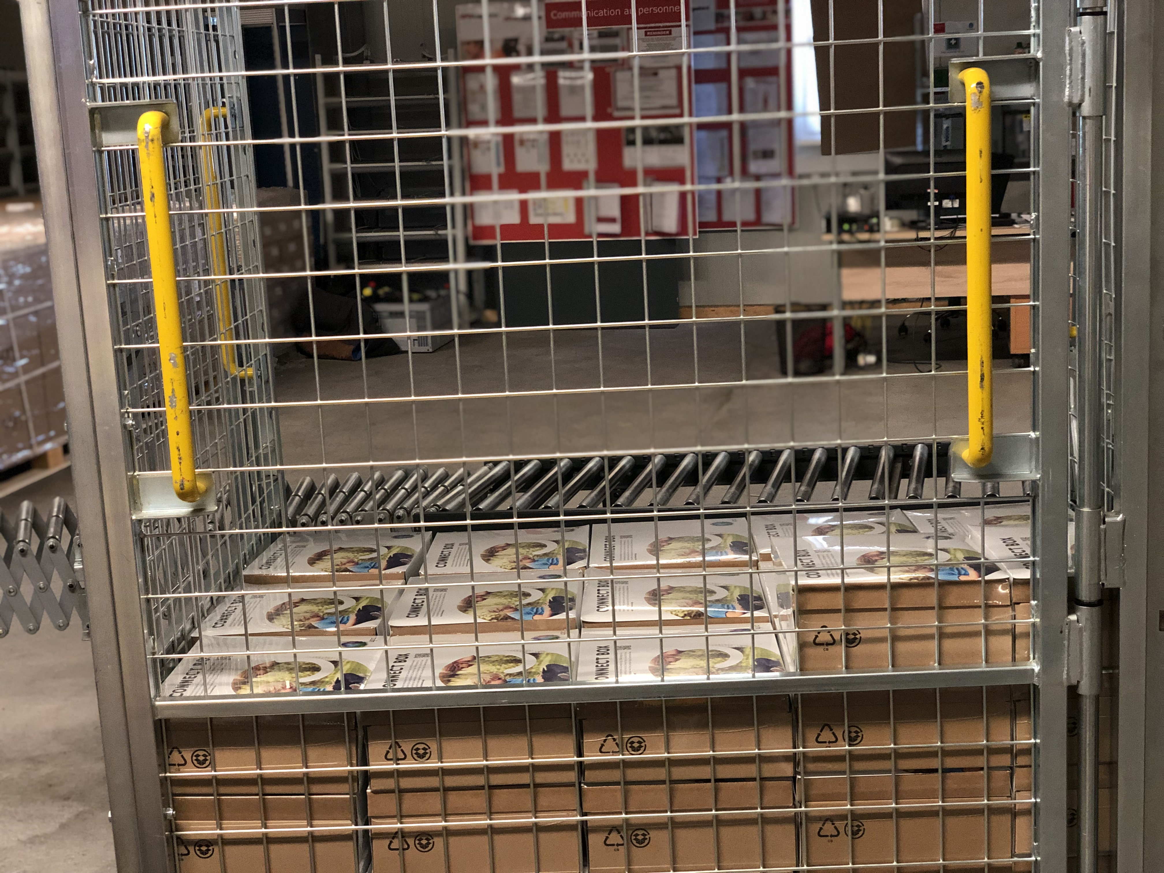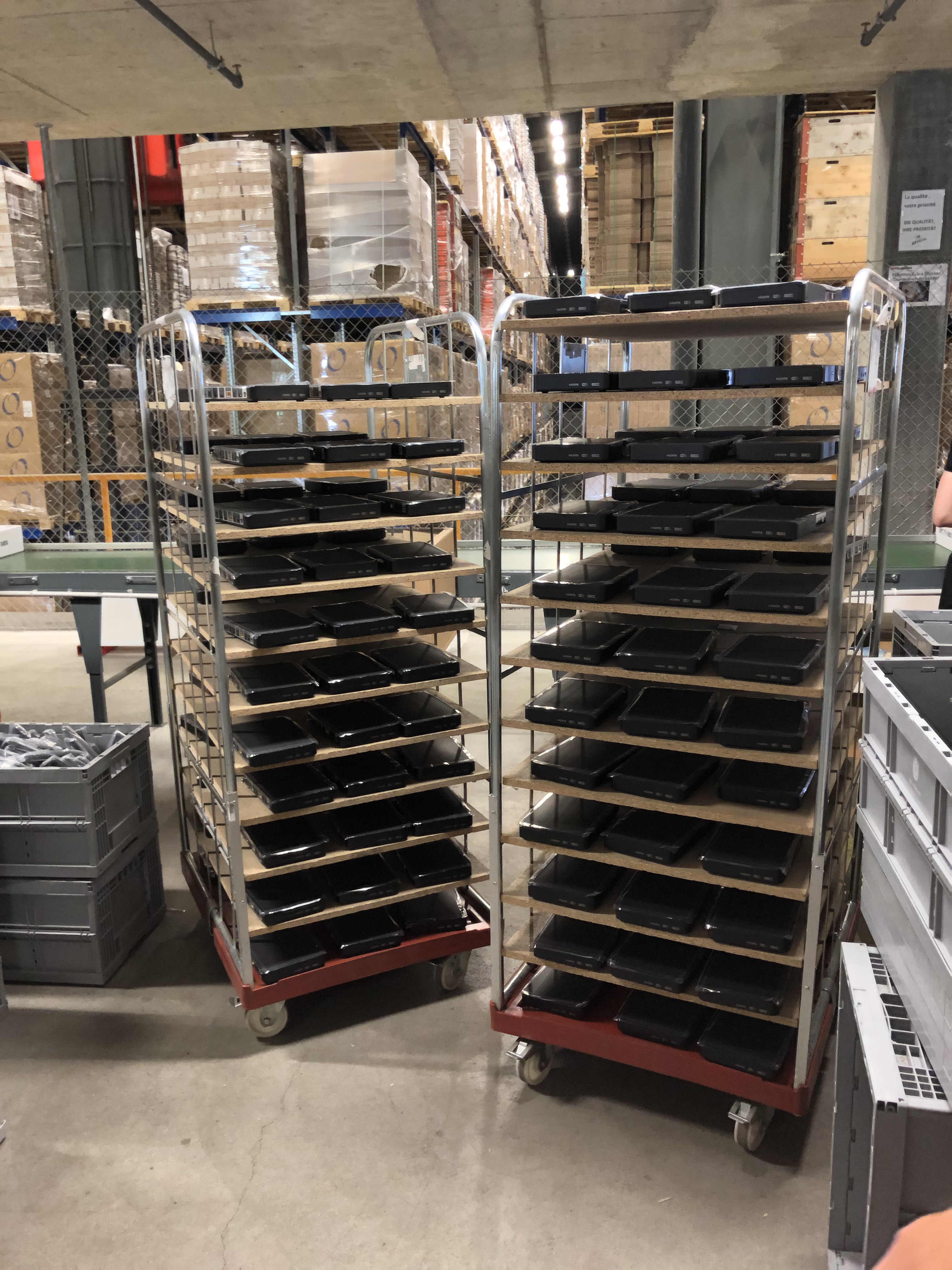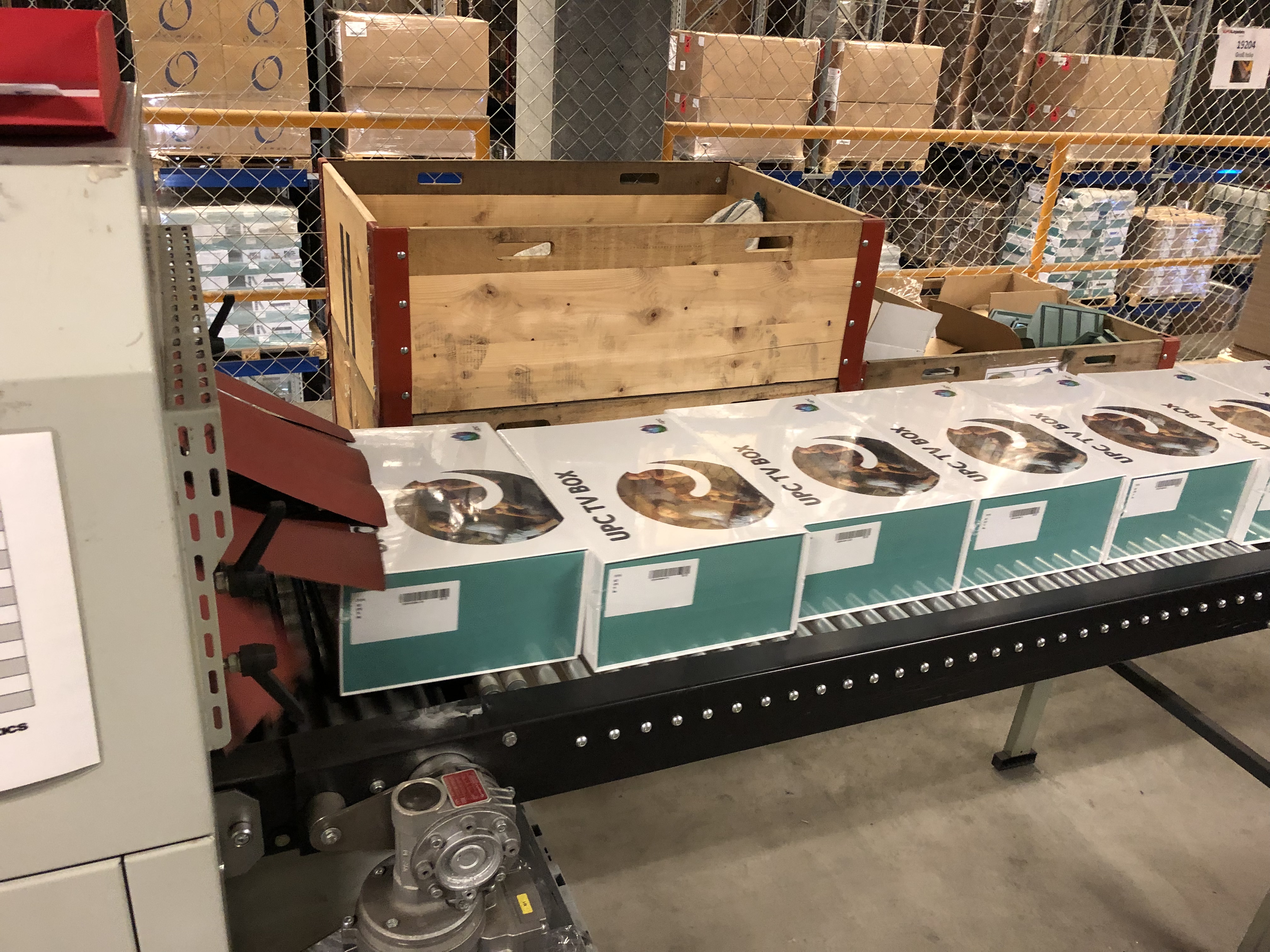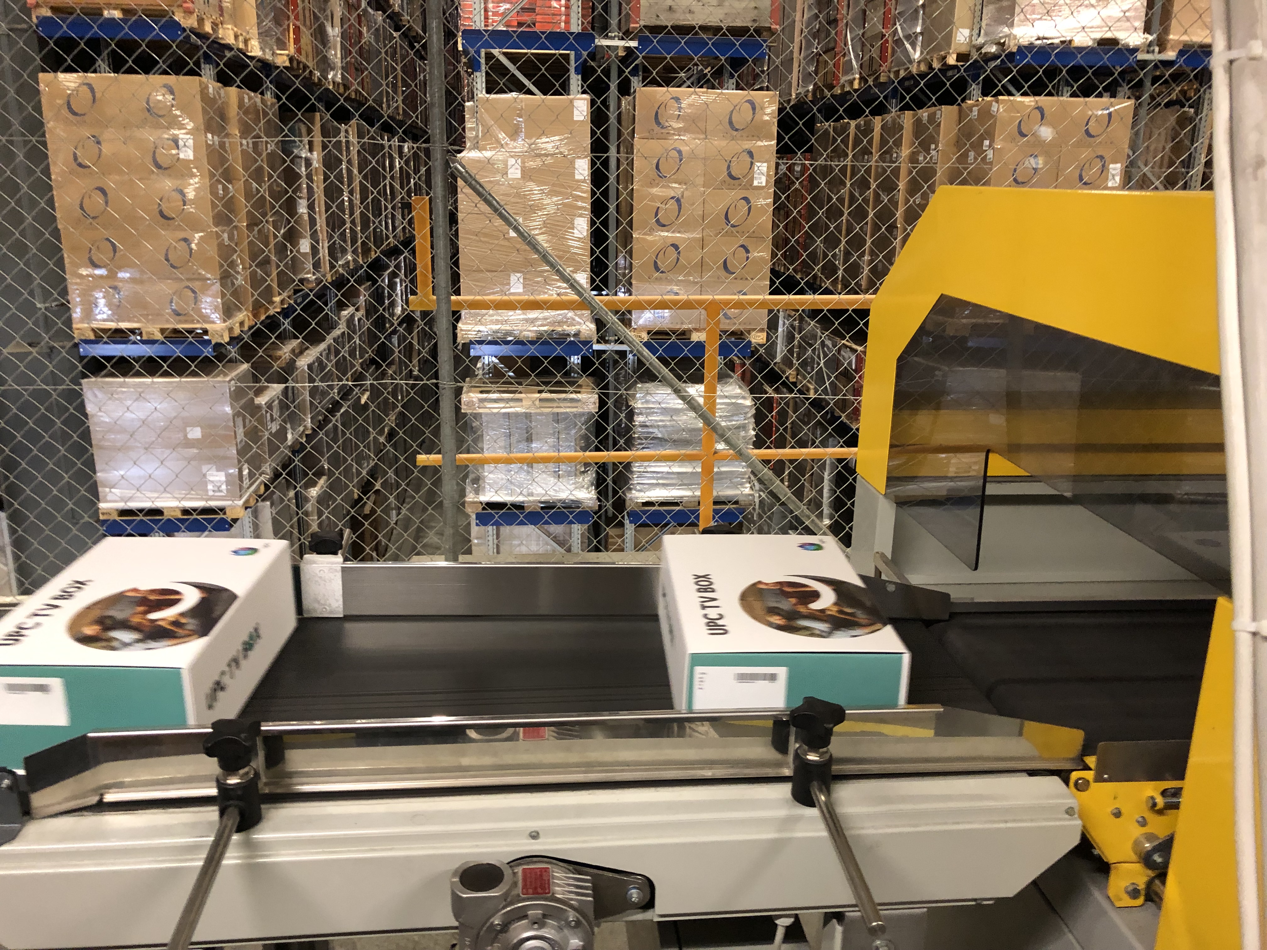 Quando sono nello shop online di UPC e confermo la mia ordinazione, quest’ultima alcuni secondi dopo viene registrata nel nostro sistema con i dati dei clienti. In una fase successiva, l’ordinazione passa a SAP, il sistema con il quale lavora il nostro partner logistico. Una volta ricevuta l’ordinazione, i collaboratori vanno a prendere la merce, la impacchettano, compilano la bolla d’accompagnamento e infine inviano il pacco. Tutti i dispositivi per i nostri clienti arrivano in magazzino come merce sfusa, quindi materiale grezzo. Qui questa merce viene spacchettata e completata con tutta una serie di accessori: telecomando, cavo HDMI, cavo LAN, guida all’installazione rapida e alimentatore. Il tutto viene impacchettato con attenzione in una scatola con il branding del marchio UPC. Il nostro partner logistico chiama questa operazione «assemblaggio». In seguito, il pacco finisce su un nastro trasportatore per essere ricoperto con una pellicola protettiva, che viene riscaldata per restringersi e assumere la forma del pacco.